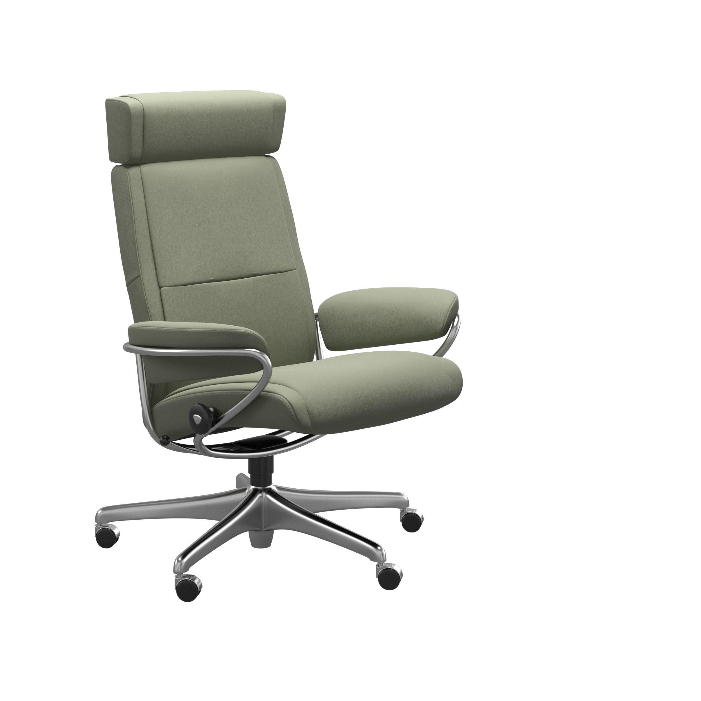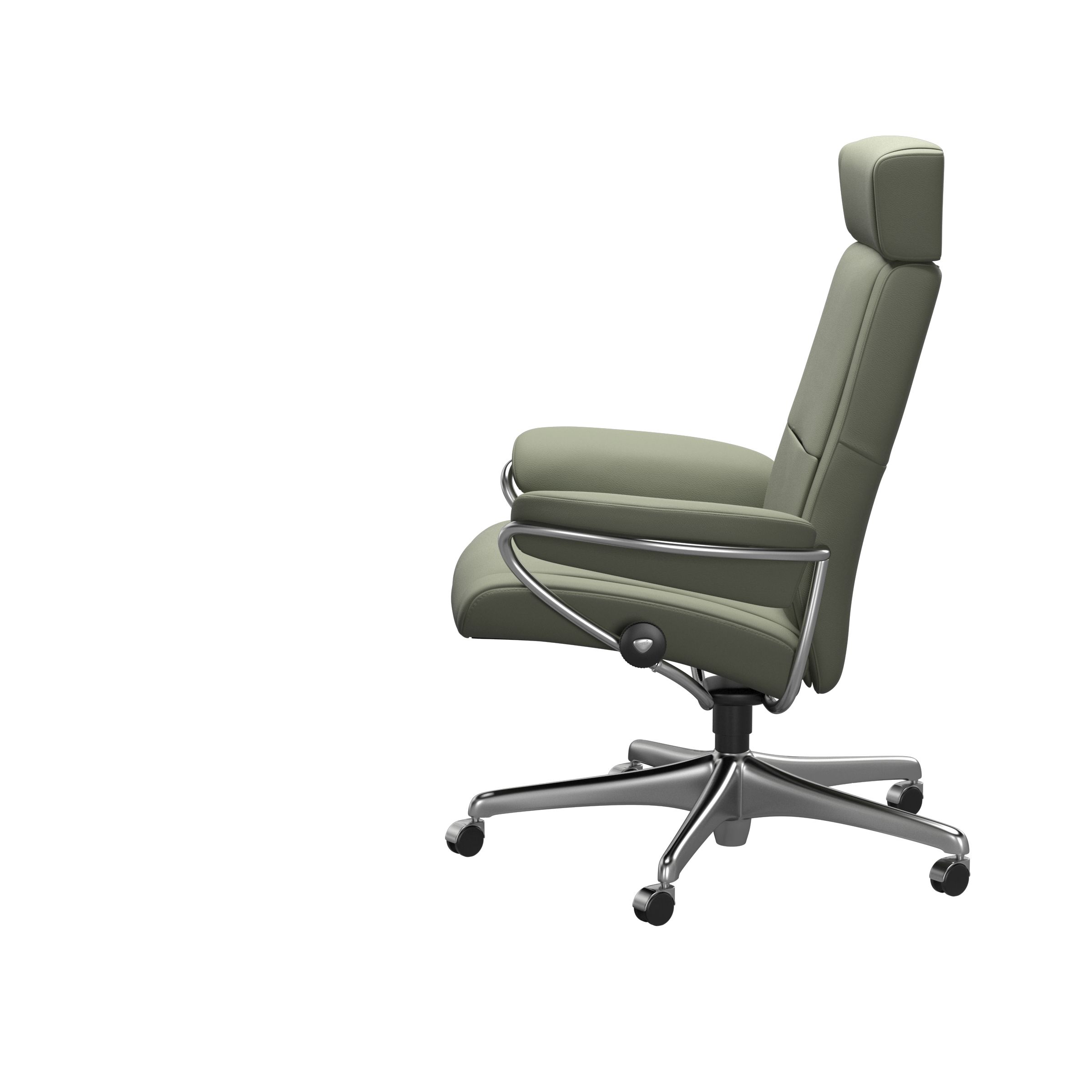 Der Stressless Paris Home Office hat eine schlanke und elegante Form. Dank der bekannten Stressless-Funktionen, erhalten Sie einen modernen Stuhl mit großartigem Komfort. Dieses Design ist mit drei verschiedenen Rückenhöhen erhältlich: niedriger Rücken, hoher Rücken und verstellbarer Kopfstütze (+ 10 cm). Die Räder an der Basis erleichtern das Bewegen und es gibt einen Hebel zur Höhenverstellung.