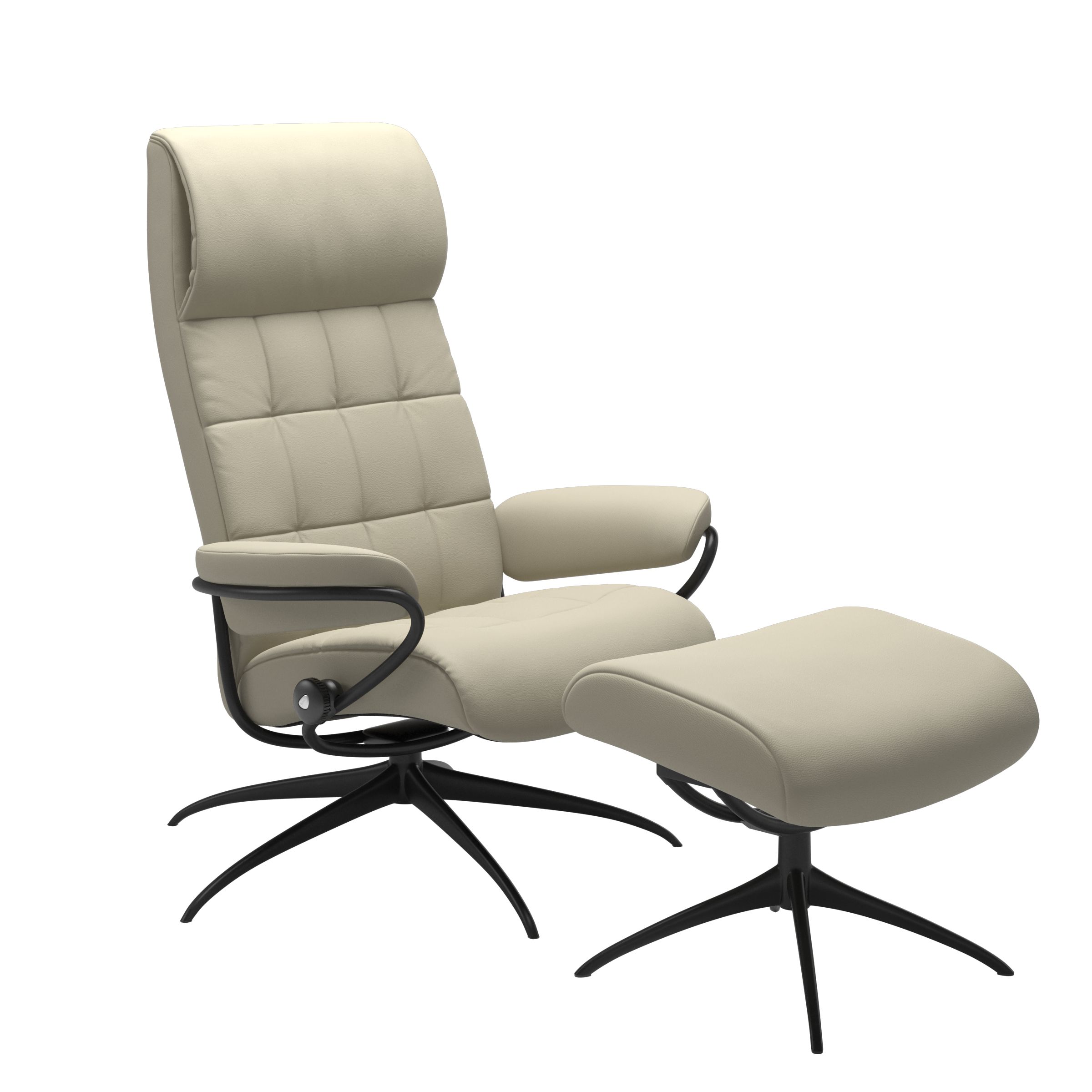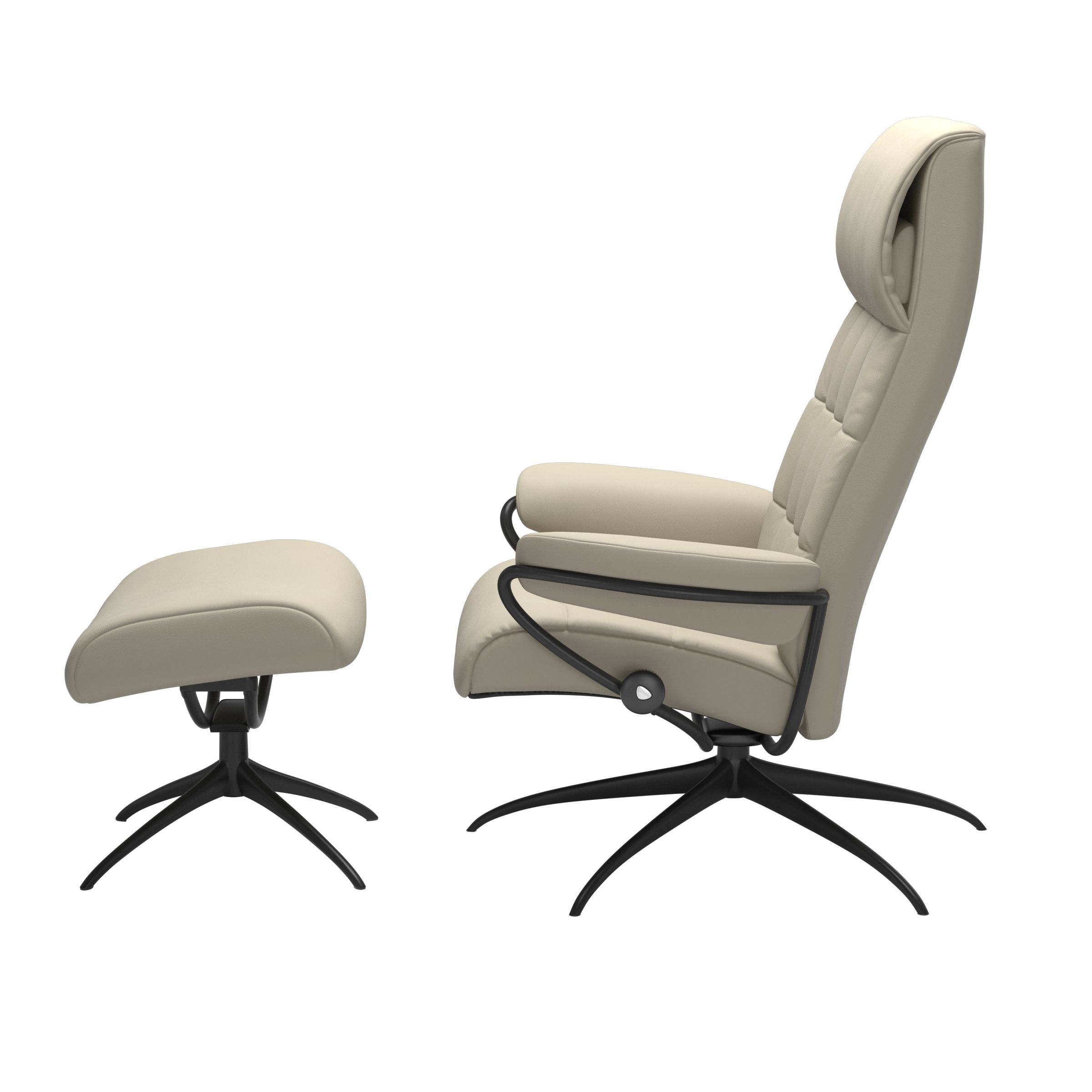En Sessel mit Swing. Stressless London hat sich von den Swinging 60´s inspirieren lassen und das Potential, eine echter Klassiker zu werden. Das bedeutet aber nicht, dass wir irgendwelche Abstriche beim bewährten Stressless-Komfort gemacht hätten. Er ist sowohl mit hoher als auch niedriger Rückenlehne erhältlich und der passende Fußhocker spendet Ihren Füßen den wohlverdienten Komfort. Dieses Modell ist mit Standardhöhe oder mit einem höheren Untergestell erhältlich. (+4 cm Sitzhöhe und Höhe).